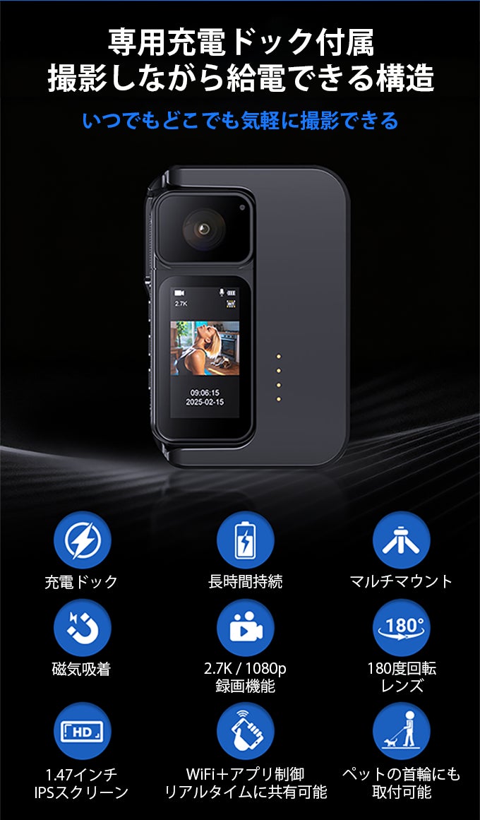 本体左側に充電端子を配置しており、専用ドックに差し込むだけで充電しながら撮影が可能です。また本体背面には強力なマグネットを内蔵しており、付属ストラップと組み合わせることで、固定したまま角度調整も行えます。さらに、充電ドックには三脚マウントを搭載しており、スタンド設置や据え置き撮影にも対応します。