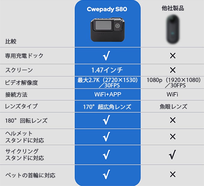 「Cwepady S80」は、2.7K高解像度撮影に対応しており、1080P/30FPSでも鮮明な映像を記録できます。