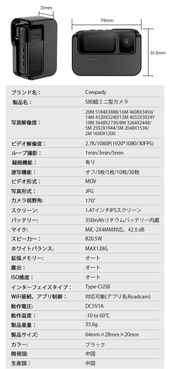 超ミニ型カメラ「Cwepady S80」は、使いやすさと携帯性を両立した設計を採用しています。