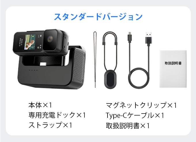 A1:本体には350mAhのバッテリーを内蔵しており、最大約1時間の連続録画が可能です。また、付属の1100mAh充電ドックを併用することで、2〜3回分の追加入力ができ、合計で約3〜4時間使用できます。