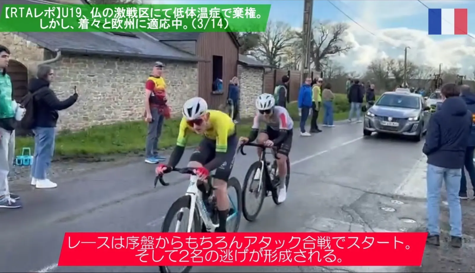U19ジュニアは第2戦目、雨と風で知られるフランス・ブルターニュ地方でのレースに挑戦。過酷なコンディションの中、全力を尽くし、工藤は終盤まで集団に食らいつく力走を見せましたが、最後は雨による低体温症で無念のリタイアとなりました。