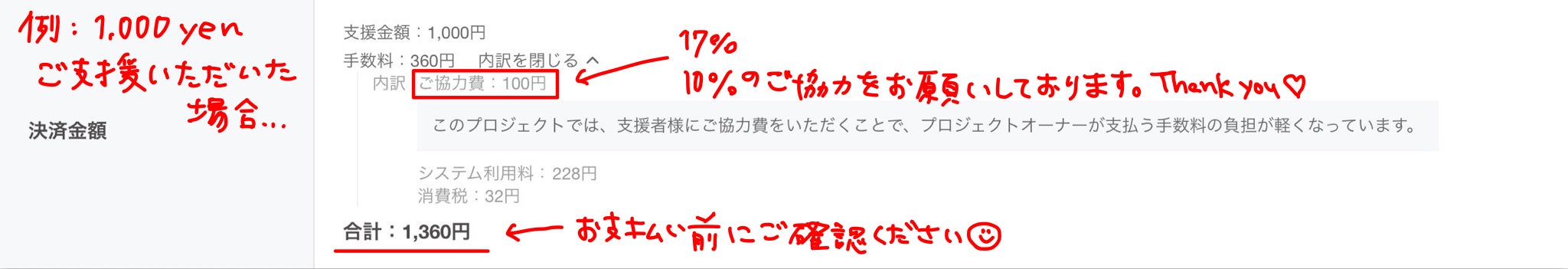 本プロジェクトには『エンタメ応援プラン』が適用されています。ご支援額、システム利用料、消費税とは別に支援額の10%を支援者さまに「ご協力費」としてお支払い頂いております。ご支援いただける際は決済金額をご確認の上ご支援ください。