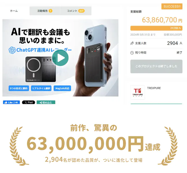 私たちはこれまで、録音体験の「不便」を根本から変えることを使命に、プロダクト開発を続けてきました。前作では、6,386万円/2,904名 という驚異的なご支援をいただき、品質・使いやすさ・サポート体制のすべてにおいて、多くのユーザーの皆さまから高い評価を獲得しました。