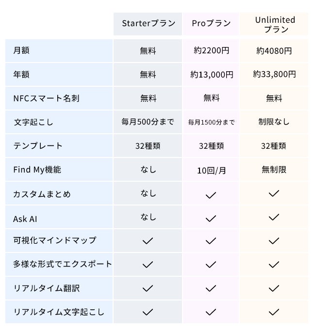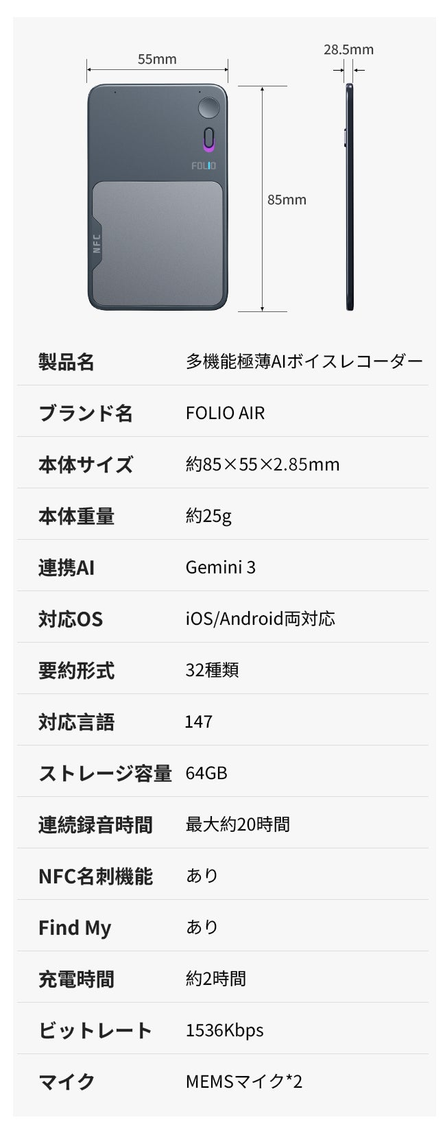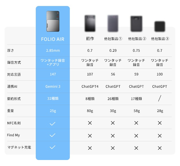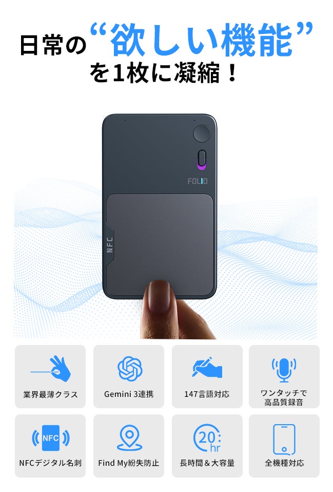 Gemini 3の高精度AIを搭載し、録音から文字起こし・要約までを“瞬時”に完了できるだけでなく、業界最薄・最軽量クラスのボディ、NFC名刺交換、Find My紛失防止 など新機能も多数追加し、これまでにない録音体験を実現するために開発しました。