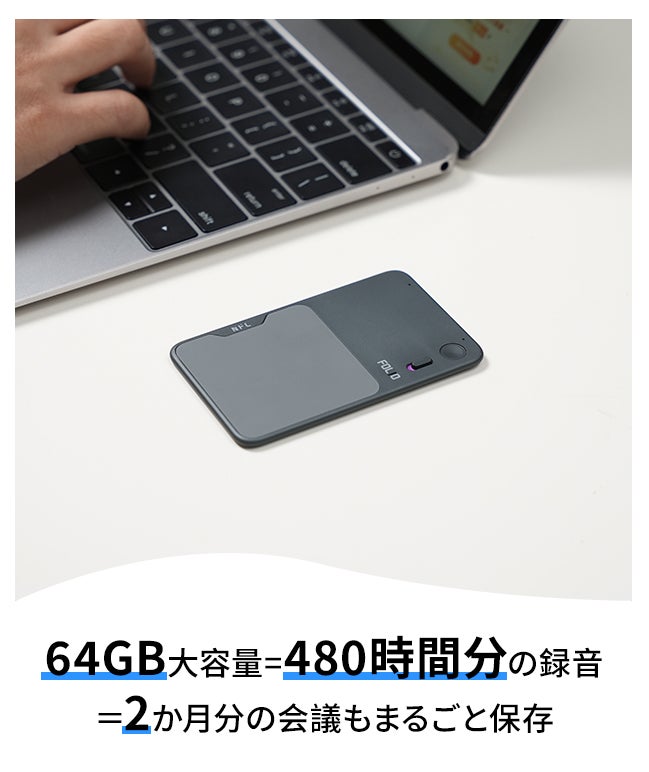 FOLIO AIR は 64GBの大容量ストレージ を搭載し、最大20時間連続録音×最大480時間分保存が可能。長時間の会議、授業、セミナー、インタビュー、出張や旅行中でも、重要な瞬間を逃さず丸ごと記録できます。