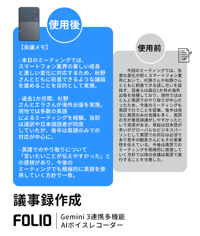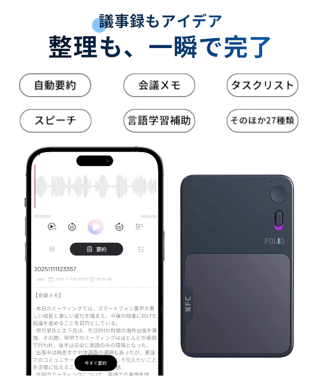そんな日常のモヤモヤを、FOLIO AIR がまるごと解決します。最先端AI(Gemini 3)連携により、「会議メモ」「契約合意」「スピーチ整理」「通話録音」「TODO リスト」など、32種類の形式に自動変換。