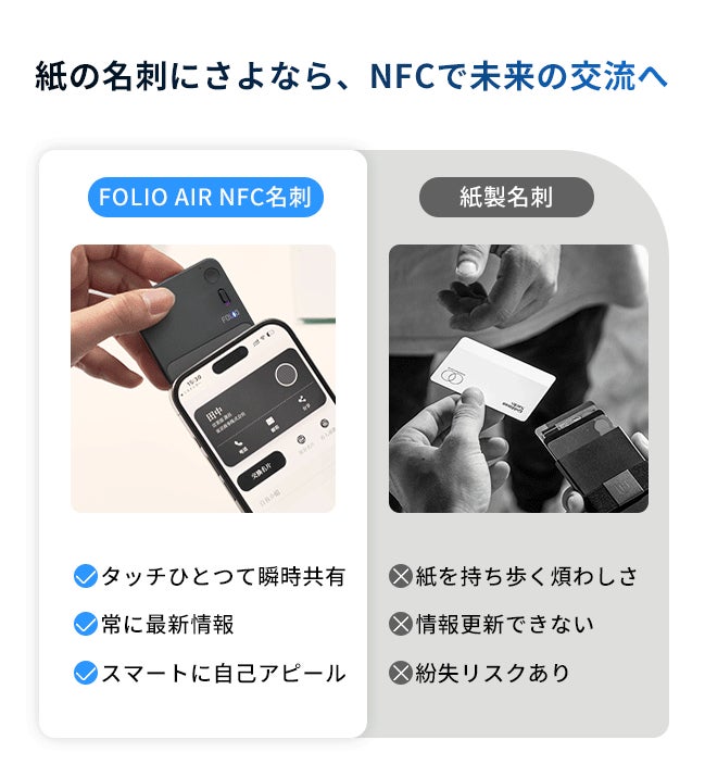 紙の名刺はもう不要。スマホに軽く触れるだけで、あなたの情報やリンクが瞬時に表示され、電子名刺として送信可能。