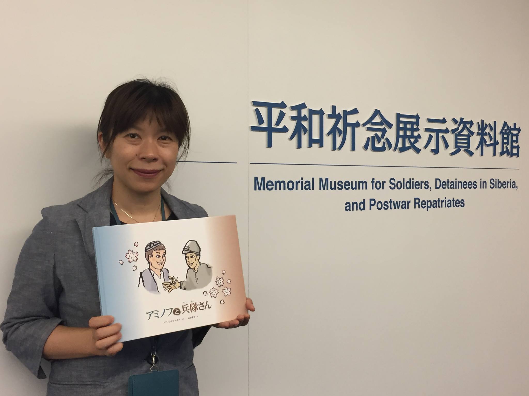 先日、藤堂 栄子さんにご尽力をいただき、東京都新宿にある平和祈念展示資料館様に絵本「アミノフと兵隊さん」を寄贈させていただきました。 絵本と一緒に写られているのは平和祈念展示資料館の学芸マネージャー、加藤つむぎさんです、快くご承認いただきありがとうございました。 平和祈念展示資料館とは、さきの大戦における、兵士、戦後強制抑留者および海外からの引揚者の労苦(以下、「関係者の労苦」)について、国民のより一層の理解を深めてもらうため、関係者の労苦を物語る様々な実物資料、グラフィック、映像、ジオラマなどを戦争体験のない世代にもわかりやすく展示しています。 (平和展示資料館HPより一部引用) 入場は無料になっていますので、近くの方ご興味がありましたら是非足を運んでみてください。 平和祈念展示資料館HP