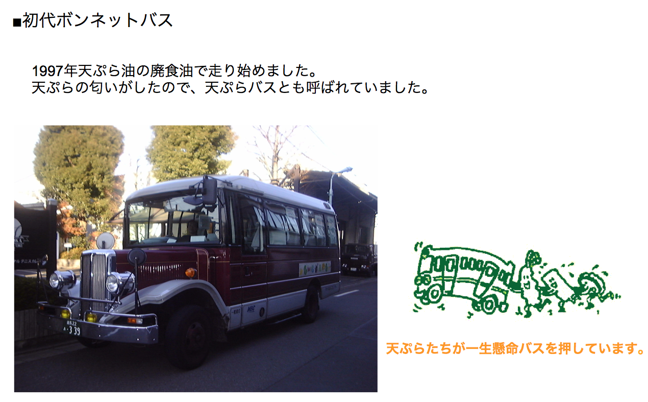 天ぷらなどに使用された植物性の廃食用油のリサイクル燃料を使用し、省エネルギーに貢献、自由が丘の街を基盤にチャレンジしてきました。