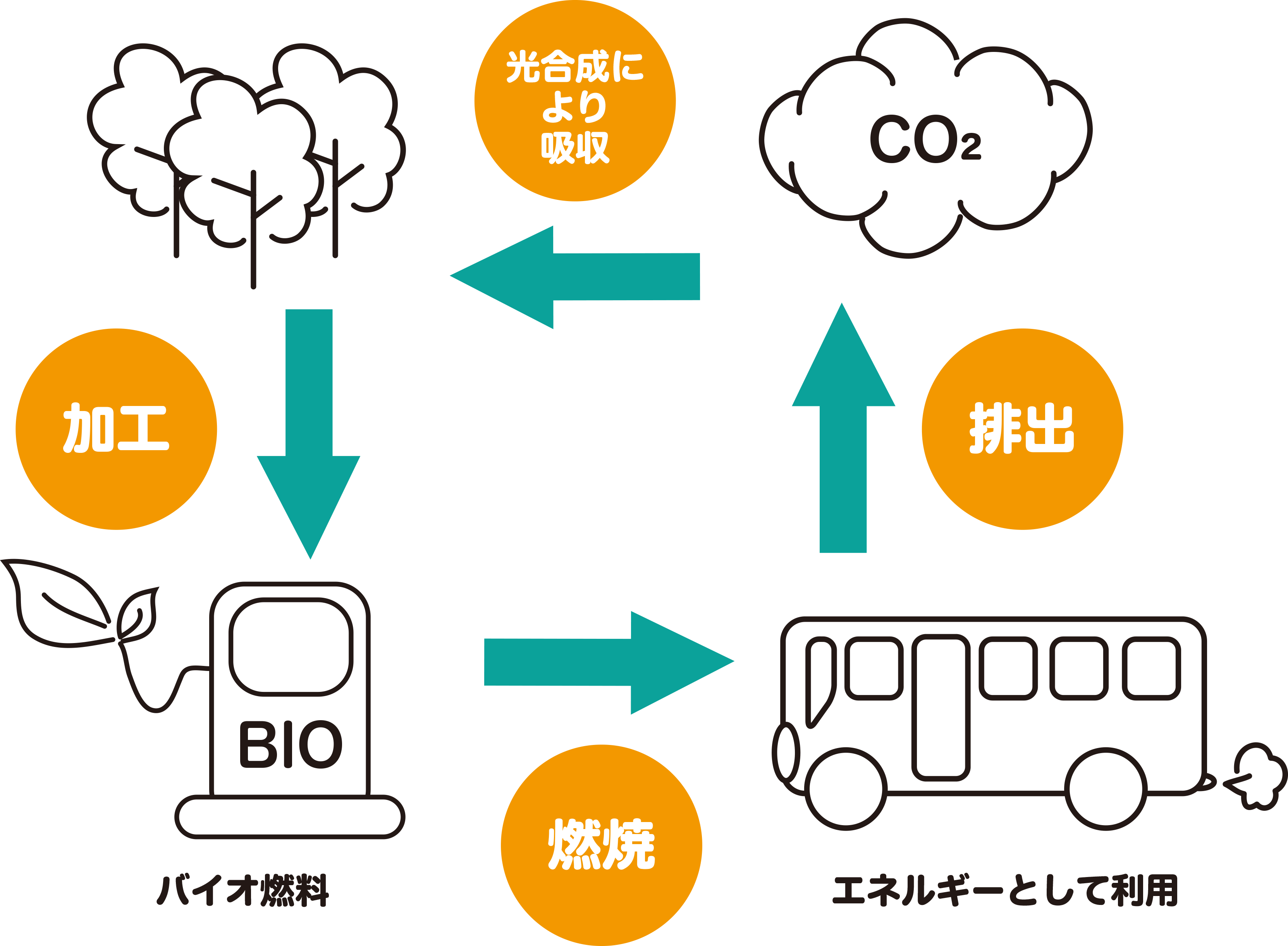リサイクル燃料=バイオ燃料は化石燃料と入れ替えることでCO2の排出削減に寄与しやすいと考えられています。原料となるバイオマスは、植物など光合成によって大気中のCO2を吸収して成長するものです。こうして育った植物を燃料にすると、燃焼時にCO2を排出しますが、その分は成長過程で吸収されたCO2とほぼ釣り合います。この“吸収と排出のサイクル”が繰り返されるため、大気中のCO2を増やしにくい燃料とされています。