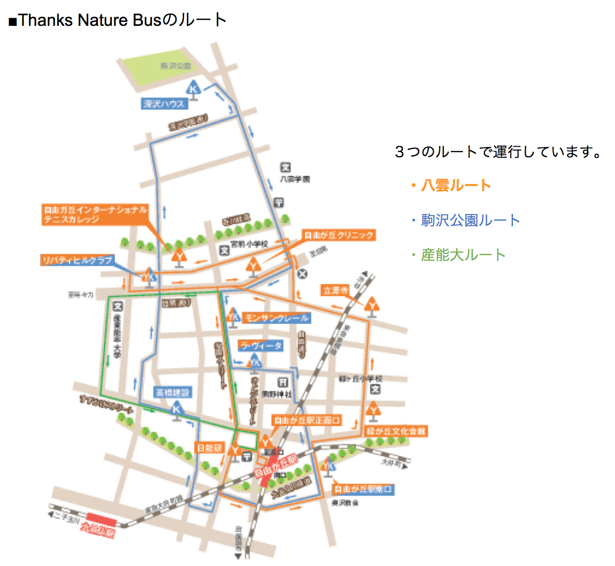 「駒沢公園ルート」、「八雲ルート」、「産業能率大学送迎バスルート」です。