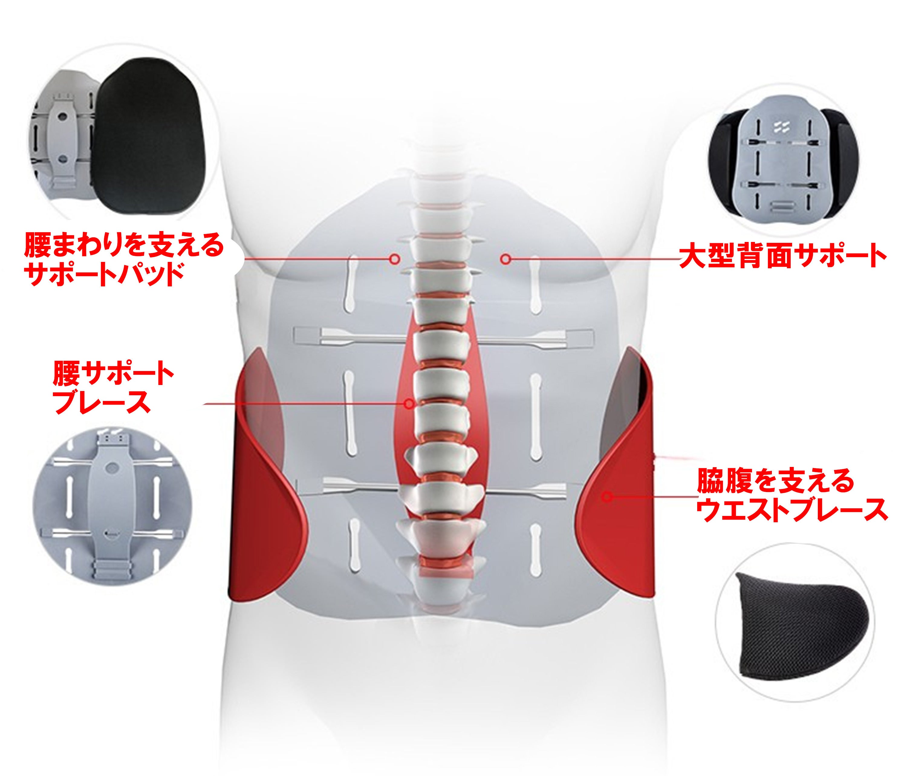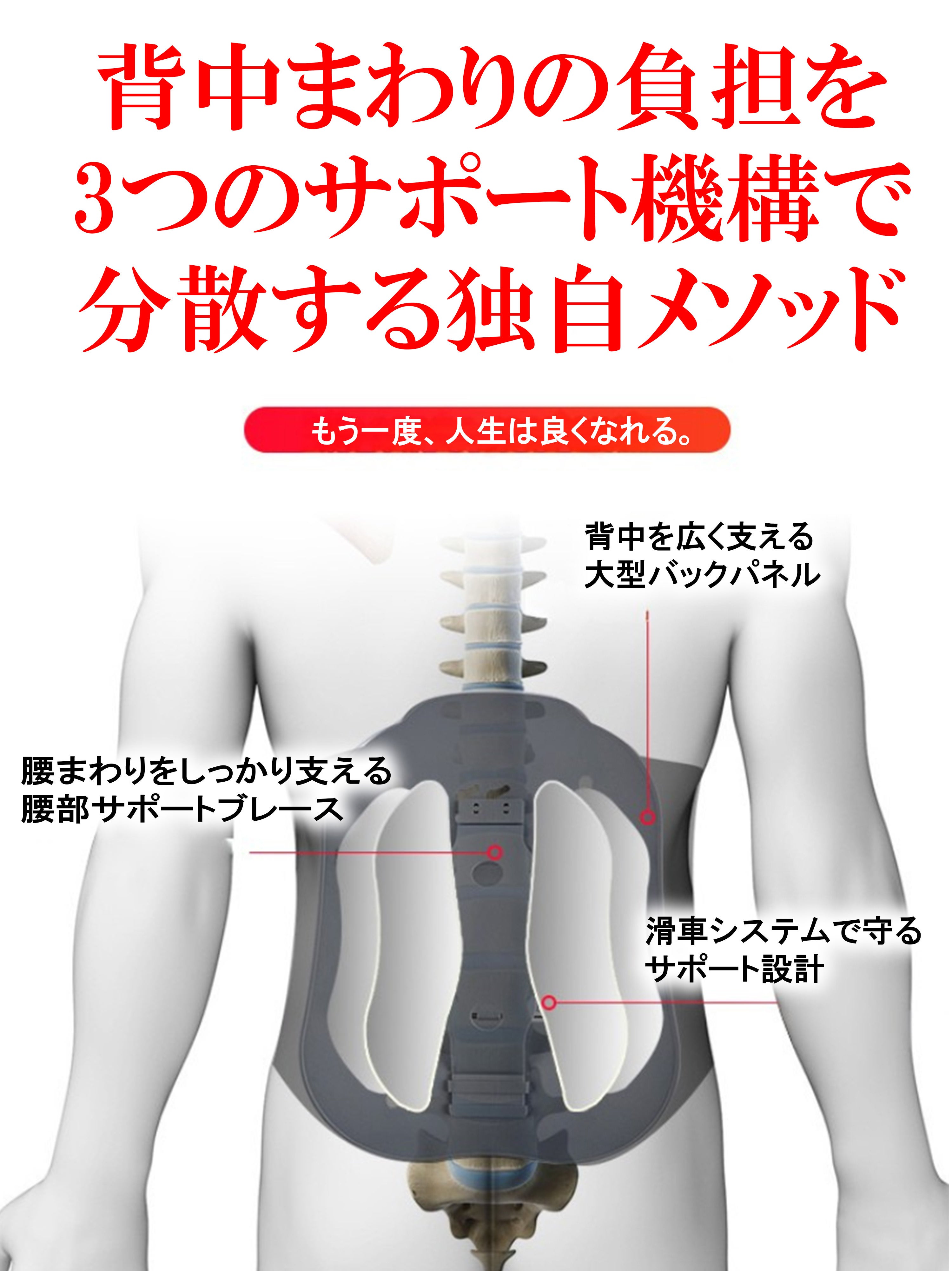背中全体を面で支える“大型バックパネル”と、腰まわりを安定させる“腰部サポートブレース”。さらに、負担を分散しながら心地よいフィット感を生み出す“プーリー機構による滑車サポート構造”を組み合わせた、独自のサポート設計です。