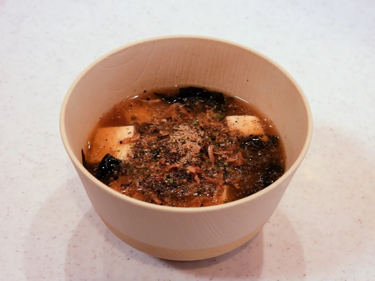 いつもの味噌汁が、『ZEN-KAKE®』をさっとひとかけするだけで栄養満点のスープに変身!
