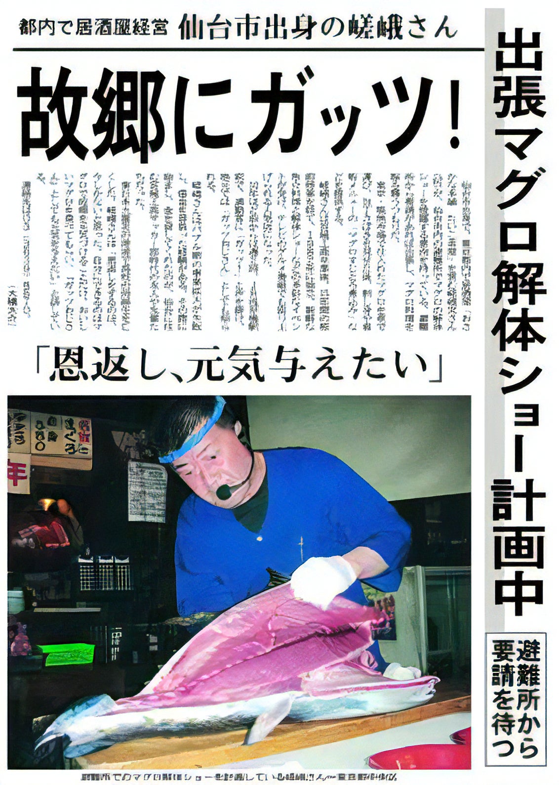 現地で辛い想いをされている皆さまに、店でも人気の「マグロ解体ショー」を見て少しでも喜んでいただき、マグロの刺身を振る舞えないだろうか?
