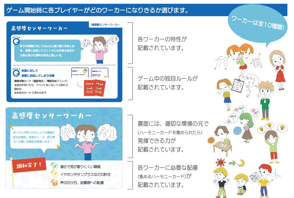 ワンダーワールドカンパニーは、精神・発達障害のある人が持つ特徴をワーカーの「独自のルール(条件)」になぞらえ、そのワーカーにとって心地よい「環境」「業務の進め方」「関わり方」を示す「ハーモニーカード」を集める協力型ゲームです。全員が様々なワーカーになりきってプレイします。