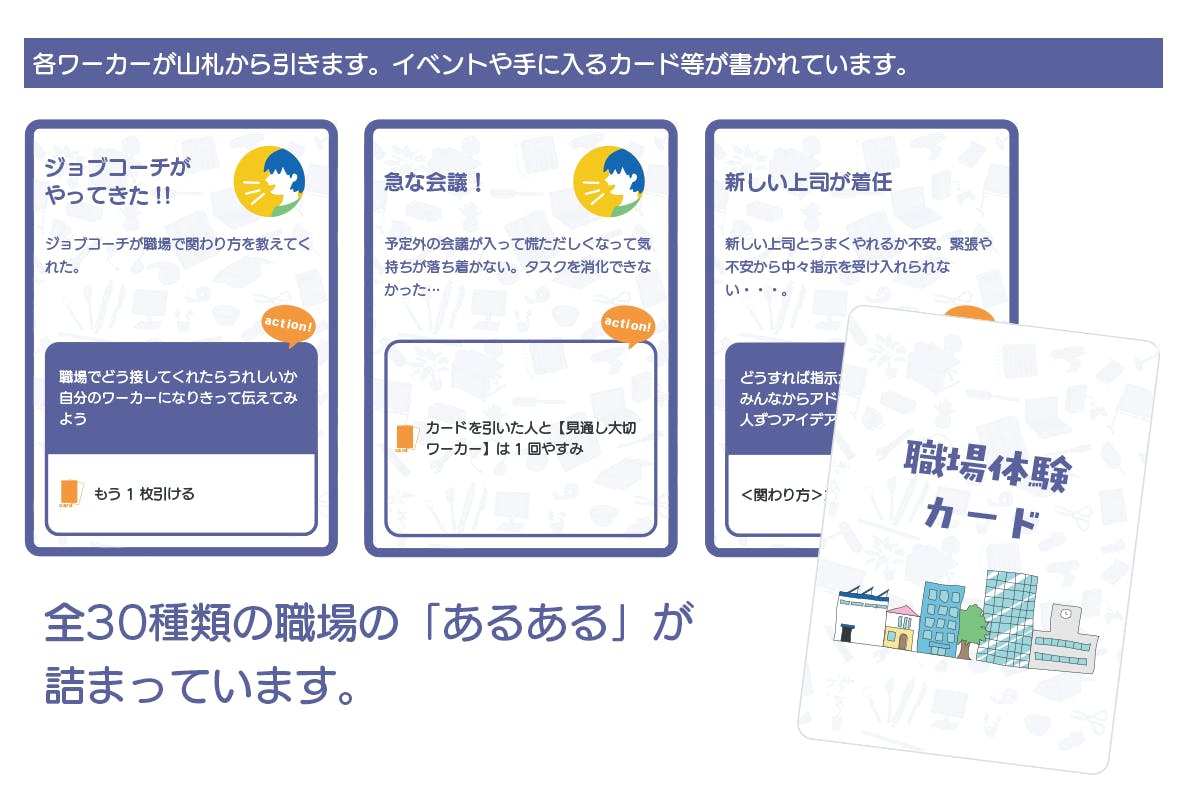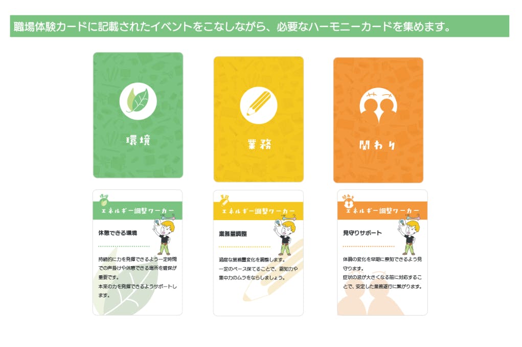 ゲーム内で「職場体験カード」に書かれたイベントを行いながら、集めるカードです。各ワーカーが職場で力を発揮するために必要な「環境」や「仕事の進め方」、「関わり方」が記載されています。