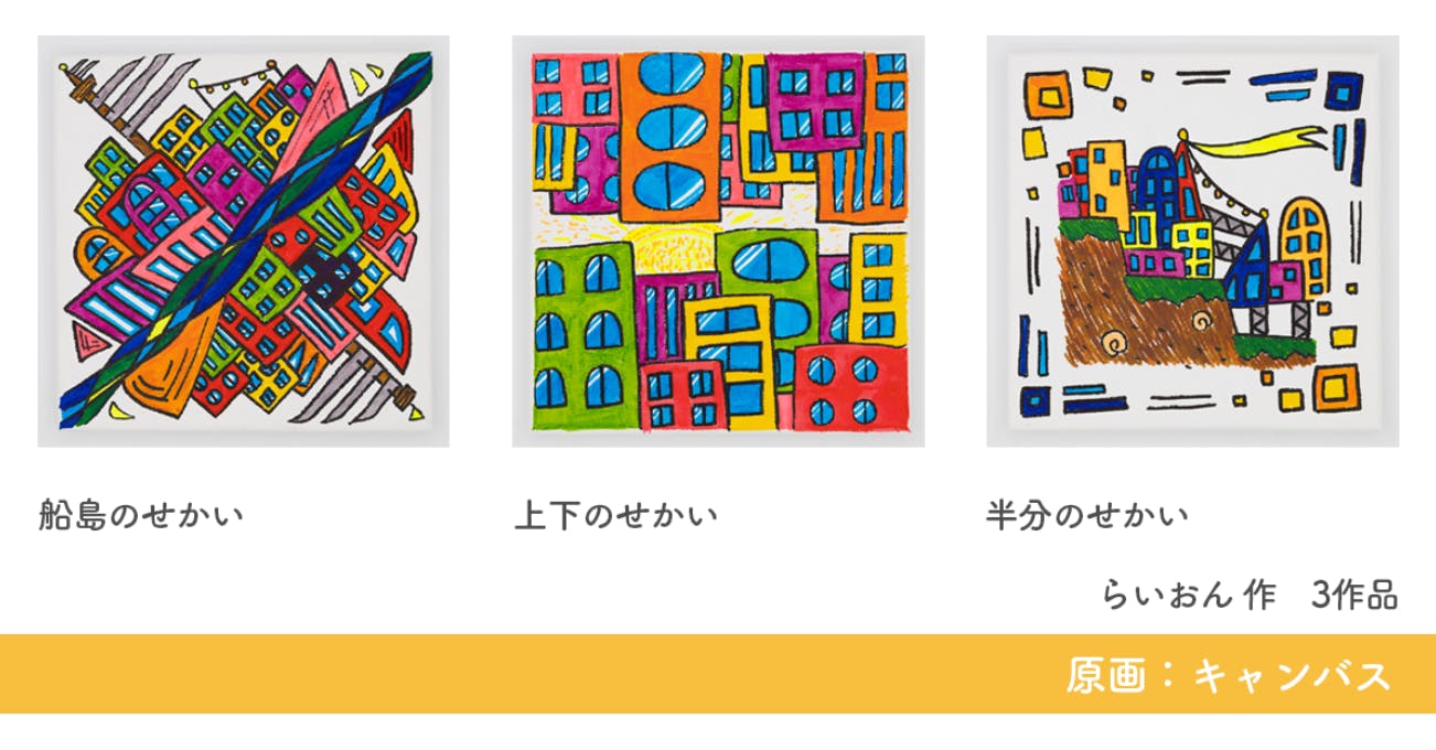 建物がある街を、地面ごと縦に半分に切って、その断面を描きました。 崖の多い街で、鉄骨で街を支えるために初めて鉄骨を描きました。この街は風が強い街で、掲げている旗のなびき方で風の強さを見て生活をします。四隅の模様は、太陽と風をイメージして描きました。こういうマークがあるところは、神様や自然を大事にしているイメージがあるからです。この街も神様への信仰が厚いですが、神様も自然も、自分が信じたいものを信じて生きていきたいです。