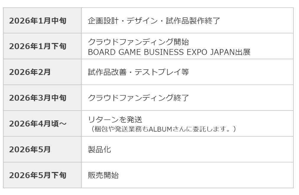現在テストプレイを重ねています。2026年1月31日(土)2月1日(日)にインテック大阪で行われる西日本最大級のボードゲームエキスポ「BOARD GAME BUSINESS EXPO JAPAN」に出展します。https://www.bgbe-j.com/page/20 「ALBUM名」で出展します。