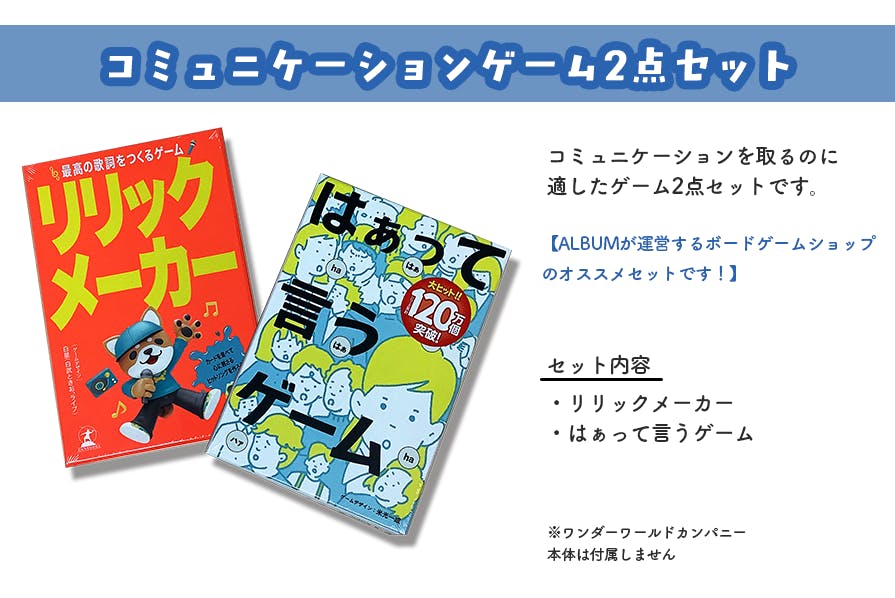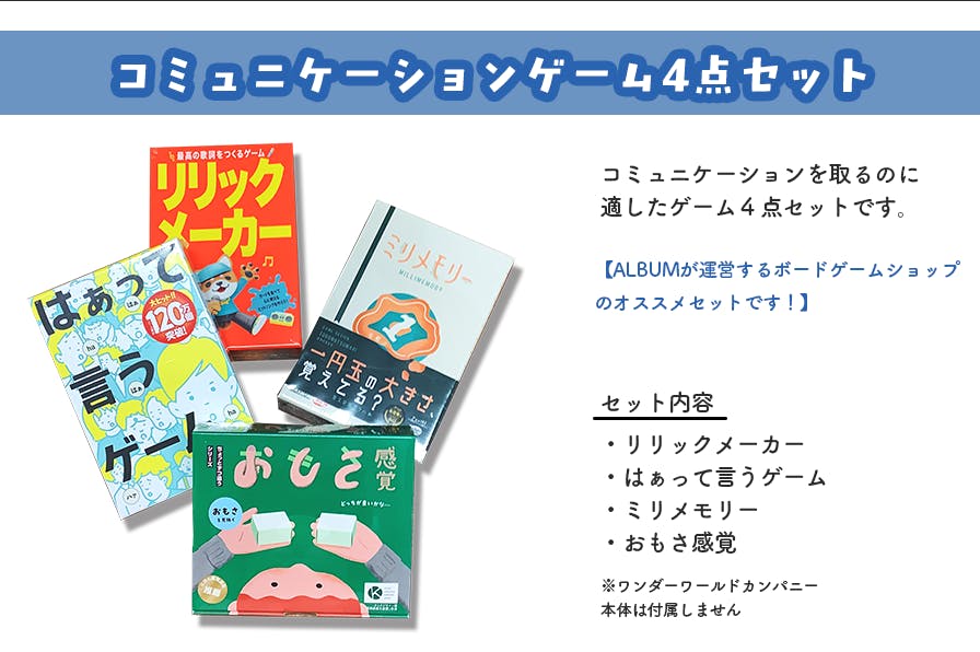 ALBUMが運営するボードゲームショップのおすすめセット。コミュニケーションツールとして複数人で楽しめるゲームセットです。※「ワンダーワールドカンパニー」は付属しません。