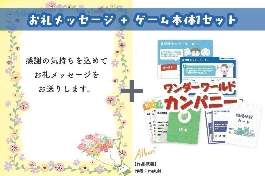 ALBUMが運営するボードゲームショップのおすすめセット。先着1名様へのご提供になります!コミュニケーションツールとして複数人で楽しめるゲームセットです。シンプルで簡単に楽しめるゲームもプラス!※「ワンダーワールドカンパニー」は付属しません。