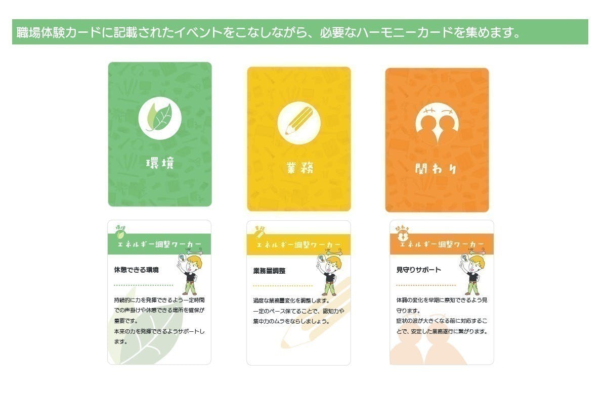 ゲーム内で「職場体験カード」に書かれたイベントを行いながら、集めるカードです。各ワーカーが職場で力を発揮するために必要な「環境」や「仕事の進め方」、「関わり方」が記載されています。