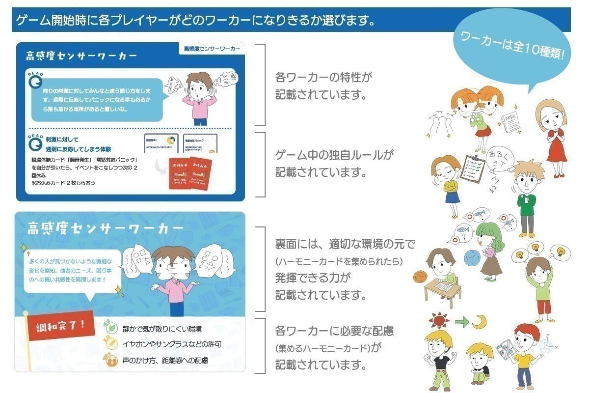 ワンダーワールドカンパニーは、精神・発達障害のある人が持つ特徴をワーカーの「独自のルール(条件)」になぞらえ、そのワーカーにとって心地よい「環境」「業務の進め方」「関わり方」を示す「ハーモニーカード」を集める協力型ゲームです。全員が様々なワーカーになりきってプレイします。