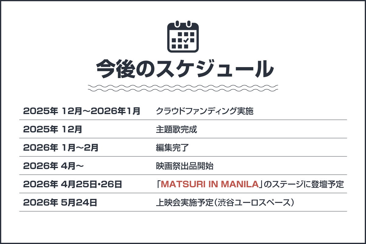 この日比国際協働で生まれた物語を世界へ届けるため、国内外の幅広い映画祭へ積極的に出品し、多くの場で作品とメッセージを発信していきます。そして―― その中のどこかで必ずレッドカーペットを歩く。それが本プロジェクトの大きな目標の一つです。国際的な舞台に立つことで、フィリピンの存在感を高め、関わるすべての人の誇りになる瞬間を創り上げます。