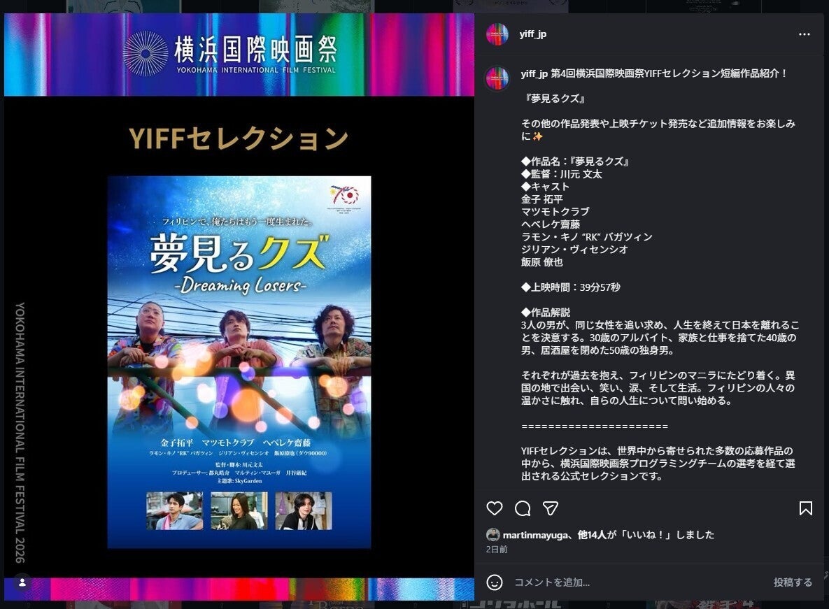 2026/03/30 17:48ご報告が大変遅くなりました。幾つか嬉しいお知らせがあります!〇第4回『横浜国際映画祭』に選出されました改めて、皆様の温かいご支援・応援、感謝いたします。ついては5月2日(土)に、なんと監督以下、出演者、スタッフ一同で「レッドカーペット」を歩きます。私も初の試みなので、今から緊張をしております。その他、船上パーティ、期間中(5月3~5日)に上映+舞台挨拶もございます。近日中にチケットも販売されますので、ぜひ会場までお越しいただけると幸いです。横浜国際映画祭今後も日本のみならず、海外の映画祭に出品して参ります。〇日本・フィリピン友好年(国交正常化70周年)事業に認定日・フィリピン国交正常化70周年とは1956年7月23日、日本とフィリピンとの間でサンフランシスコ平和条約及び日比賠償協定が発効したことにより、両国の国交が正常化しました。2026年は国交正常化70周年に当たります。両国は、この記念の年を日本・フィリピン友好年(国交正常化70周年)とし、「Weaving the Future Together: Peace, Prosperity, Possibilities/未来を共に織りなす:平和、繁栄、可能性」というテーマのもとで、日本・フィリピン交流に関連する行事やイベント等を通じて日比間の一層の友好関係の進展を図ってまいります。 この度短編映画『夢見るクズ』が、本事業の公認事業として認定をいただきました。「未来を共に織りなす:平和、繁栄、可能性」というテーマの下、日・フィリピン友好年(国交正常化70周年)記念のロゴマーク〇渋谷ユーロスペースにて上映会を実施ついにお披露目をする機会が出来ました。5月24日(日)、渋谷のユーロスペースで上映会を実施します。本上映会では、日本サイドのキャストを中心に、皆様をお迎えします。ぜひ映画館の臨場感と共に、作品を楽しんで頂ければと思います。最後に、撮影中の背景を描いた動画を制作致しました。貴重な撮影中のナマの様子を、ぜひご覧ください。 もっと見る
