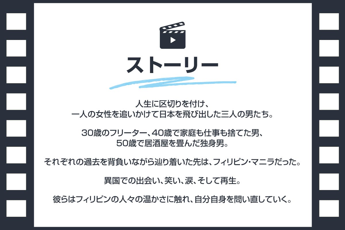 フィリピンで生きる二人の男——金子拓平と井谷厳紀——自身の人生や目的と重ね合わせて描かれる物語。「恩返し」と「再生」をテーマに、人生の希望を再び見出す人間ドラマです。