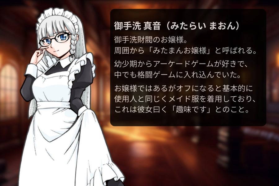 名前は「御手洗 真音/みたらい まおん」、アケゲー好きのお嬢様です。「みたまんお嬢様」の愛称で呼んであげてください。