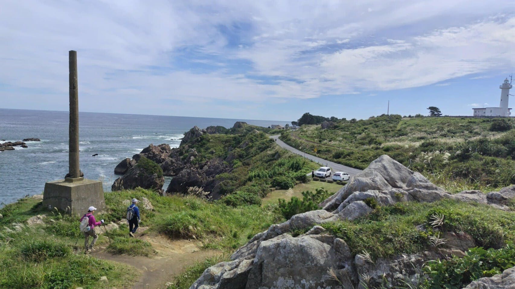 マイルポストがあるのは、種差海岸の北側、葦毛崎展望台や鮫角灯台の近く。ここは、海と岩礁、草原や海浜植物、海岸段丘といった自然が豊かなエリアです。