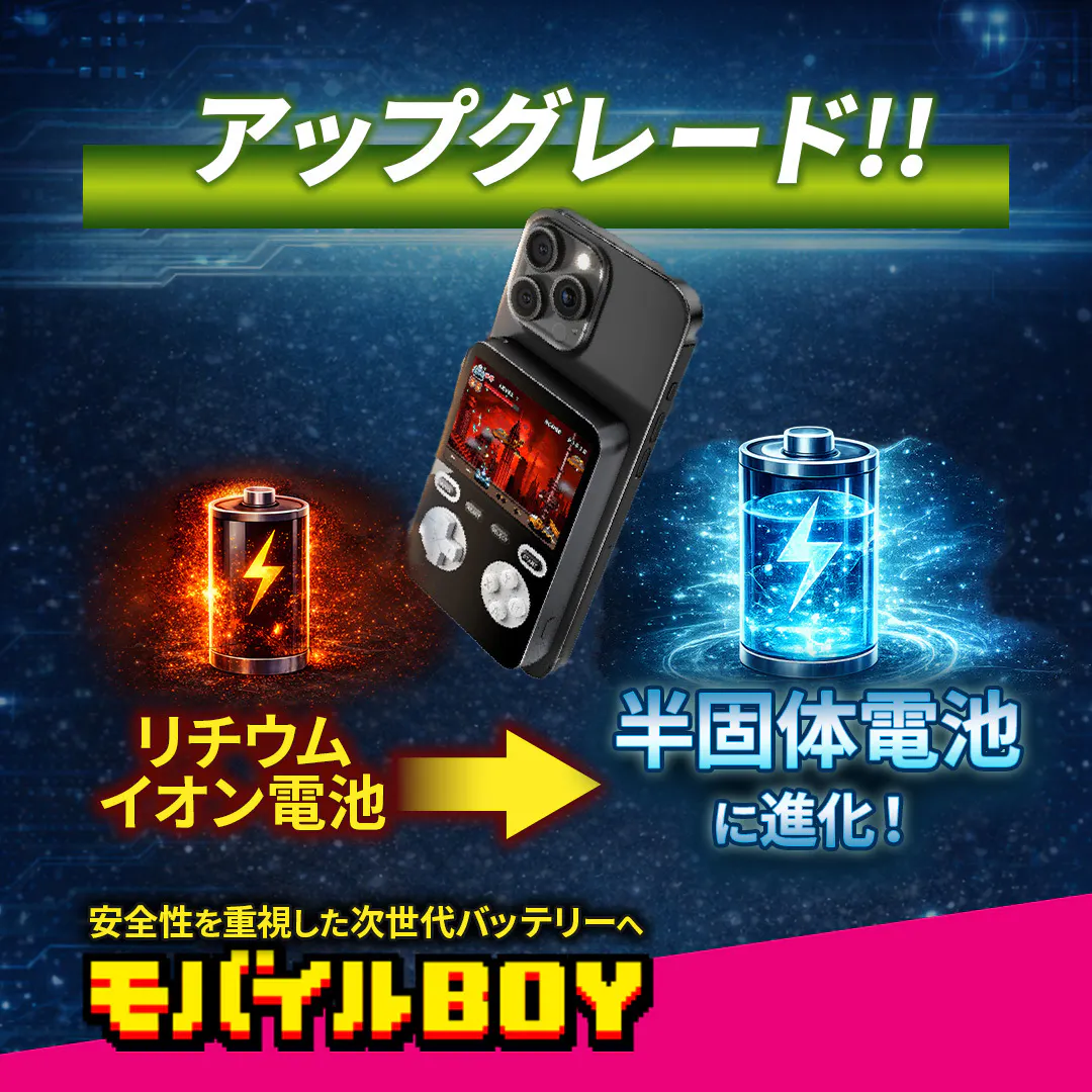 近年ニュースでも報道されておりますように、リチウムイオン電池によるモバイルバッテリーの発火事故が各地で発生しております。私たちは、お客様により安心・安全にご利用いただくために、本製品の電池をリチウムイオン電池 → 半固体電池へとアップグレードする決断をいたしました。