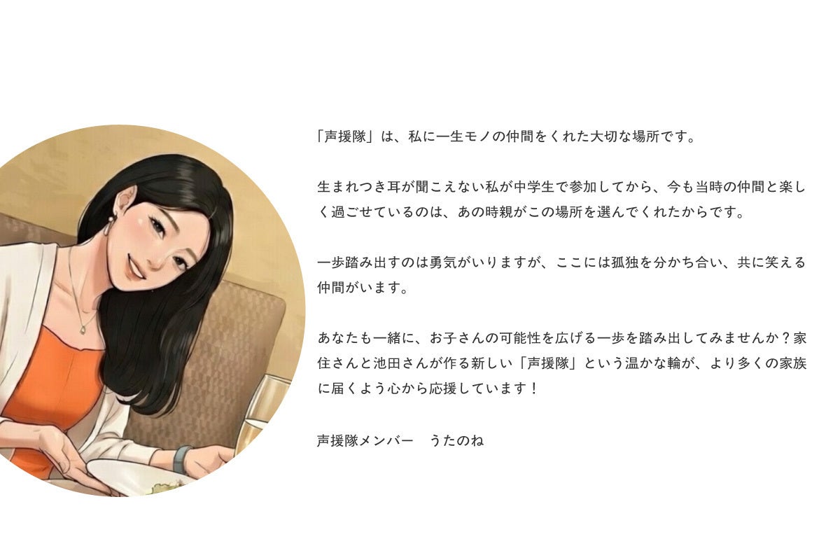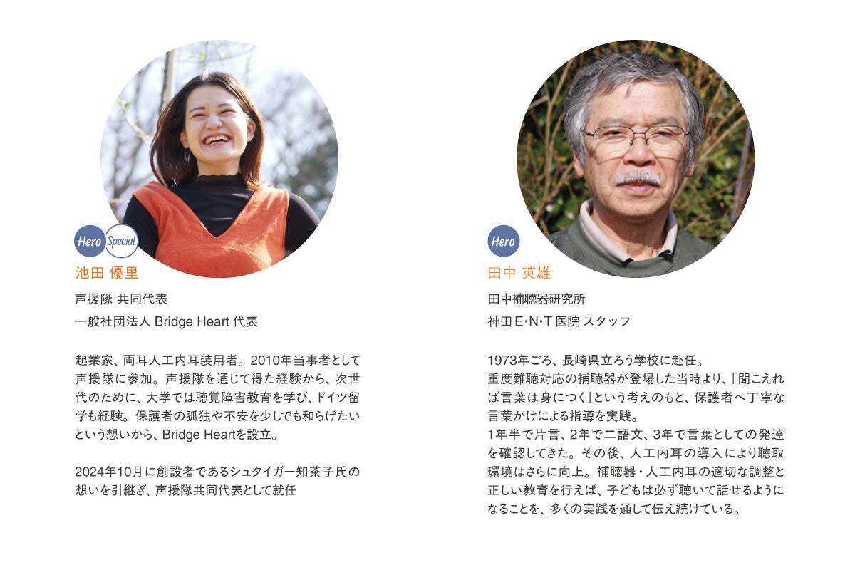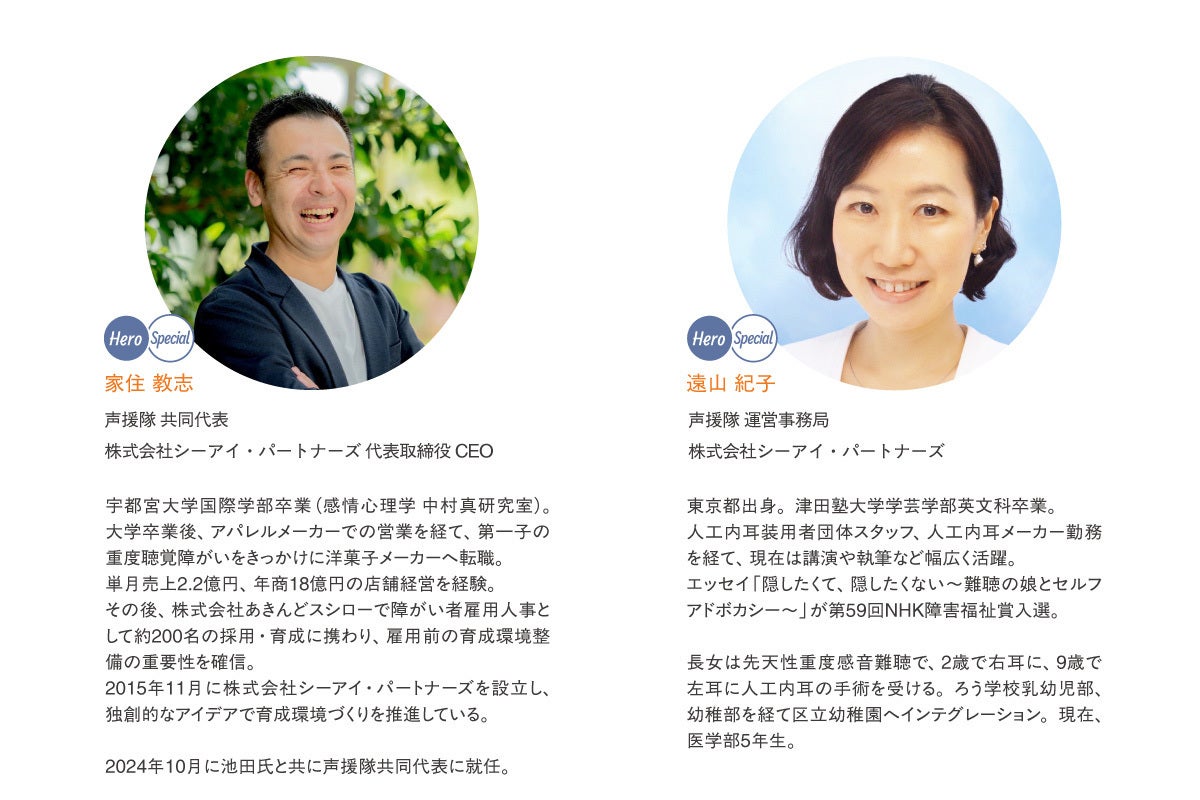 現在は、創設者であるシュタイガー知茶子氏の想いを受け継ぎ、コミュニティ参加者でもあり難聴児の親でもある株式会社シーアイ・パートナーズの代表 家住教志、難聴当事者で一般社団法人Bridge Heartの代表池田優里が、声援隊の共同代表を務めています。