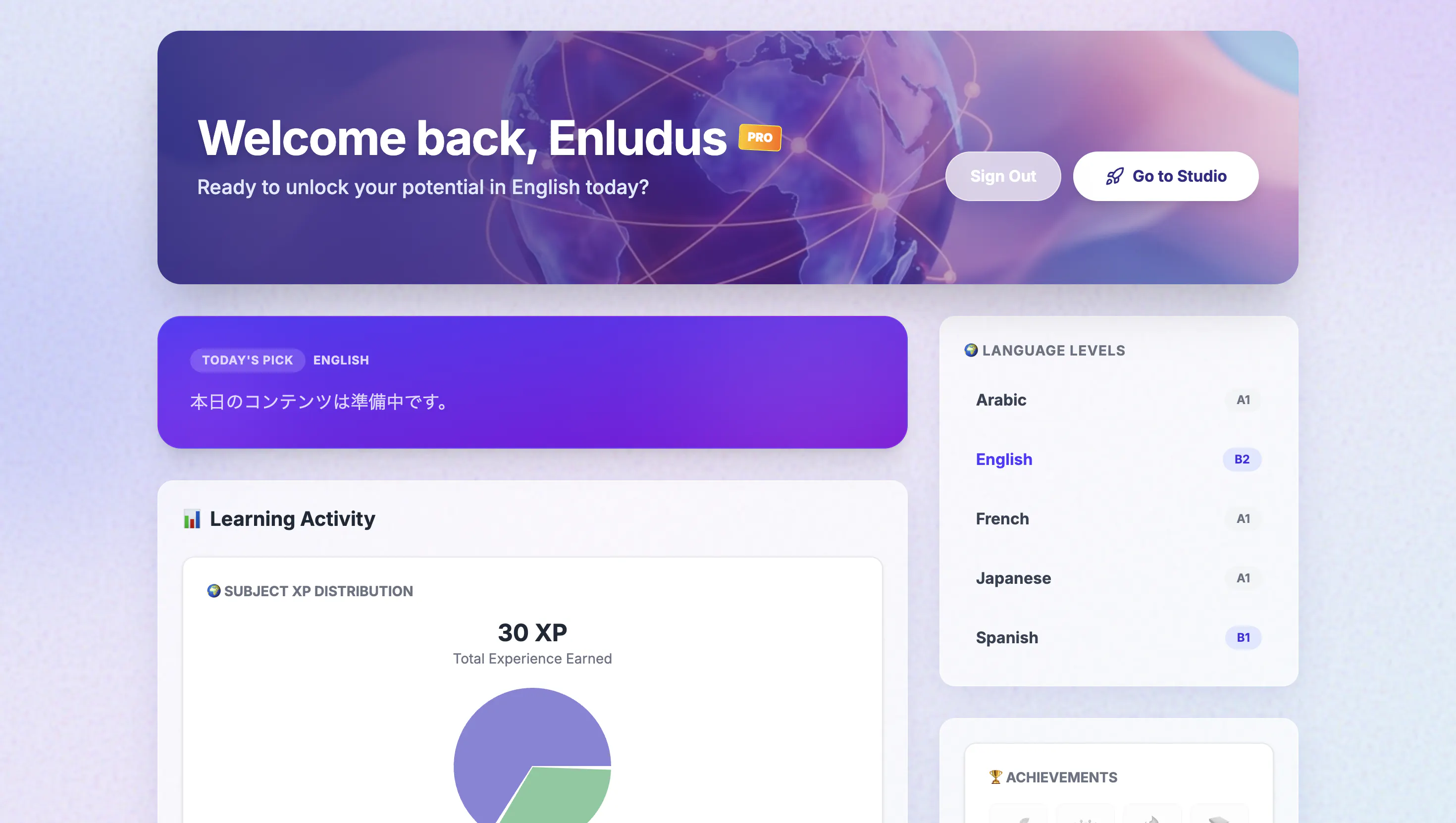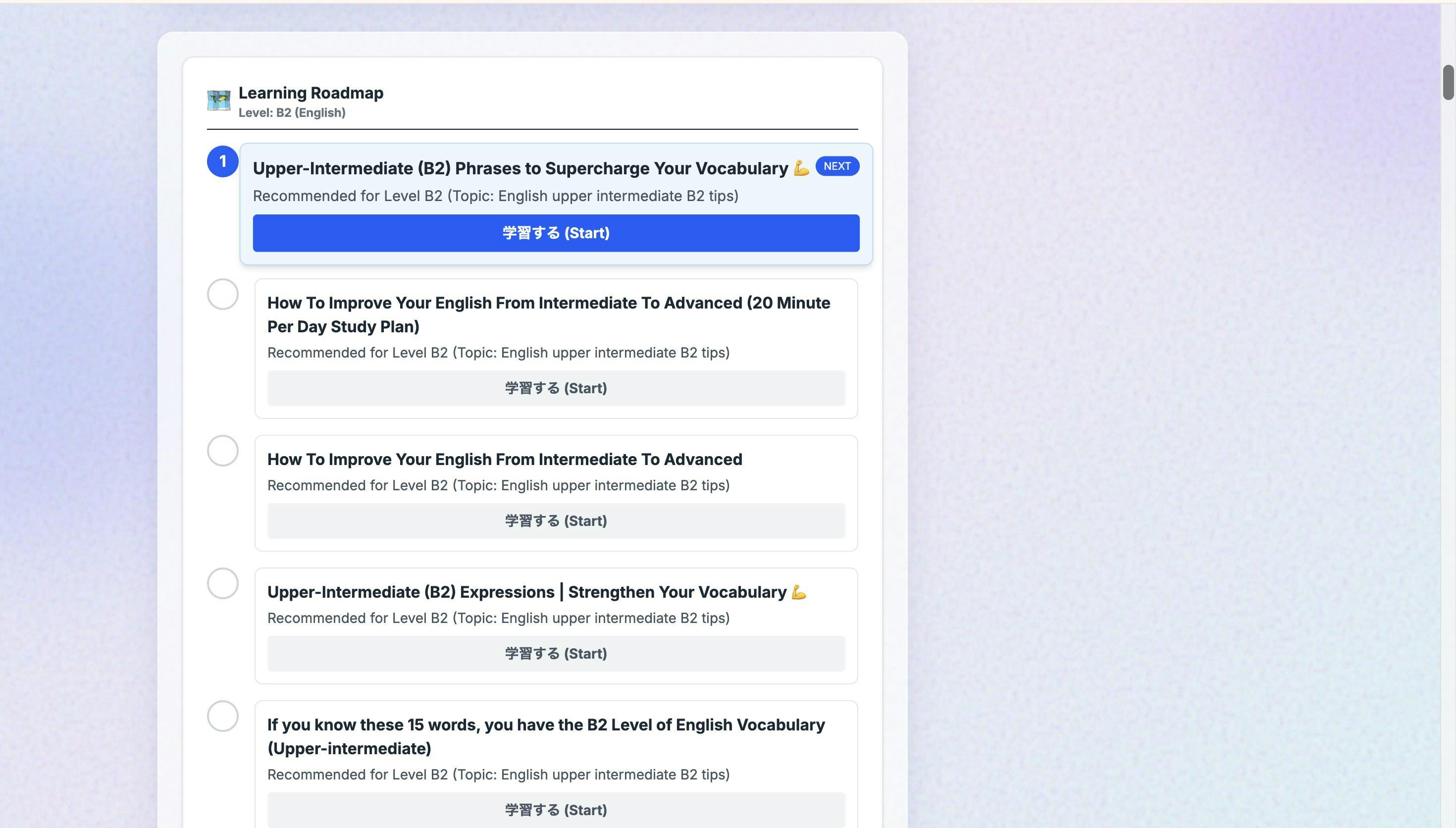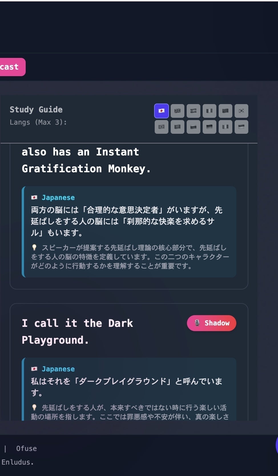 コアとなる学習システム(動画解析、単語帳、チャットボットなど)は開発完了し、現在ベータ版として公開・稼働中です。実際のページもご覧いただけます。