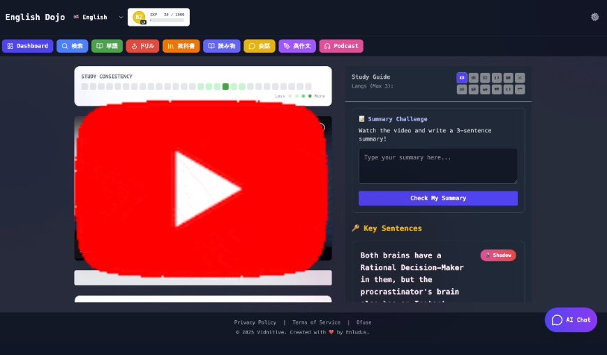 「YouTube動画を見るだけで、AIが自分専用の教科書・単語帳・テストを全自動生成する」。これがVidnitiveで実現したい次世代の語学学習です。単なる字幕ツールではなく、動画内容を解析したあなた専用の学習ガイドを作成します。