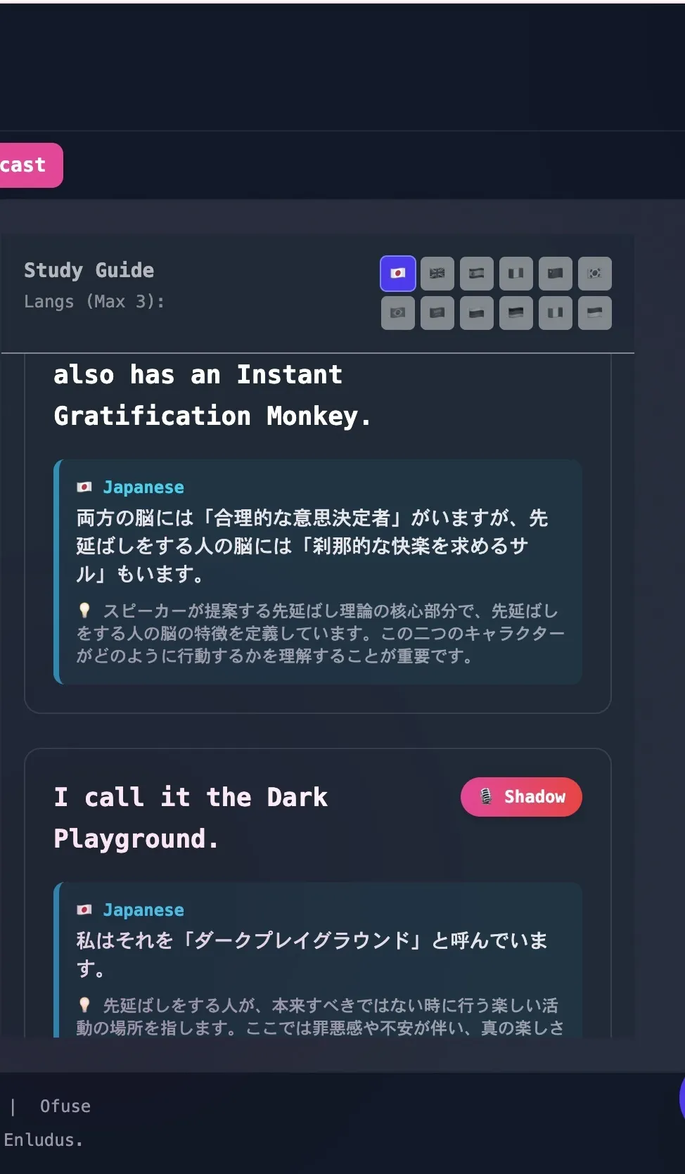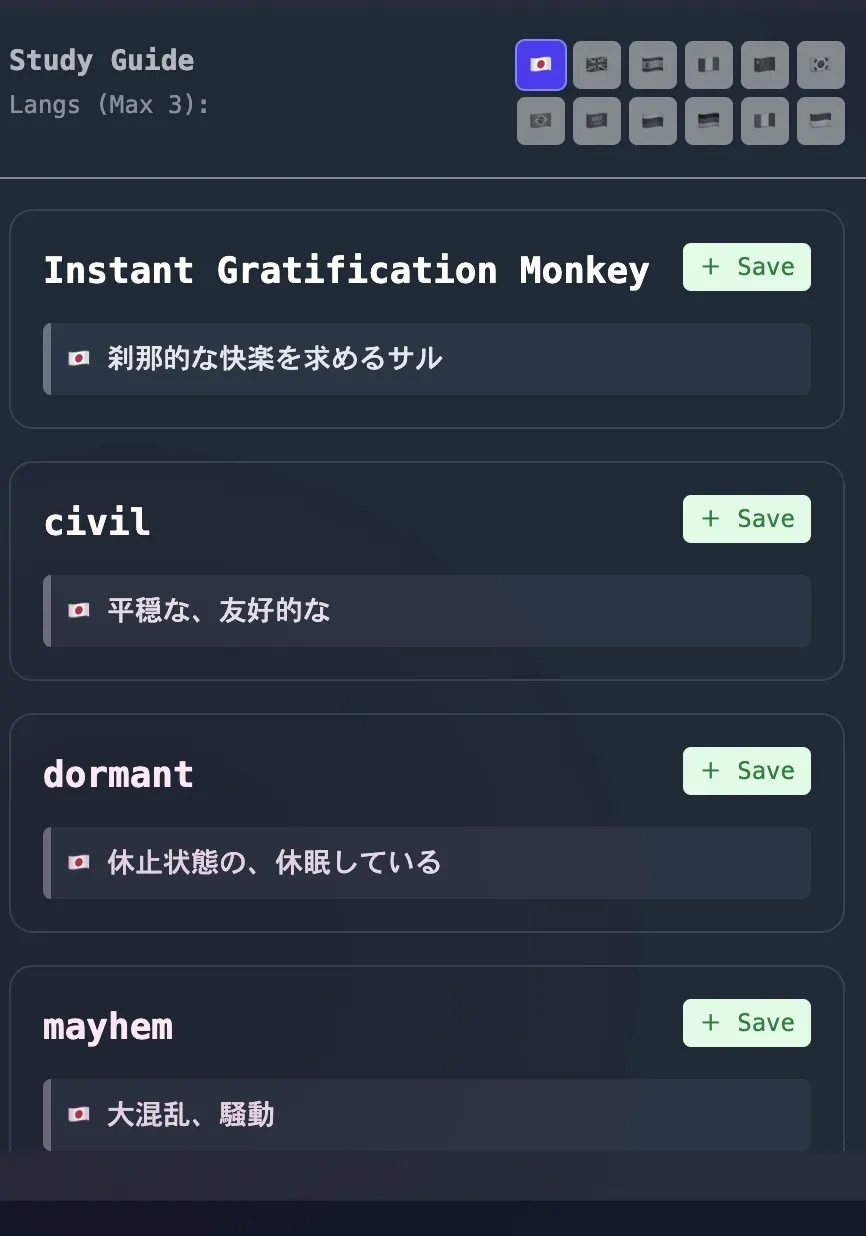 AIが動画の内容を解析し、その動画に特化した単語帳・確認テストを自動生成。ワンタップで単語の意味を保存し、後で復習できます。「好きな動画を見ていたら、いつの間にか勉強になっていた」という体験を世界中に広げます。