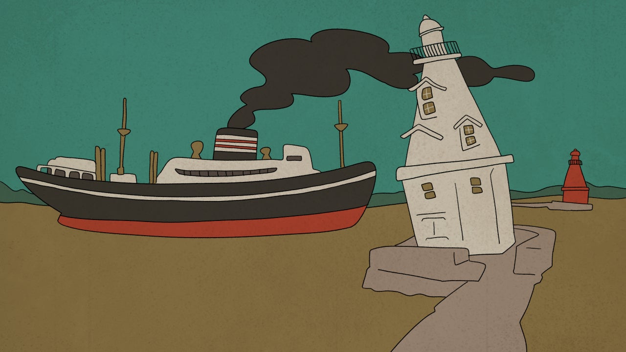 △1930年頃、横浜の港のイメージ。出来立てホヤホヤの氷川丸と、事故前の白灯台