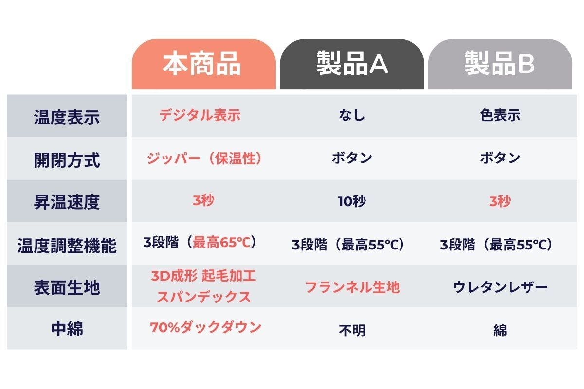 速暖・最高65℃設定・上質素材など、暖かさと使いやすさの両方で他製品と比較して優れた仕様です。