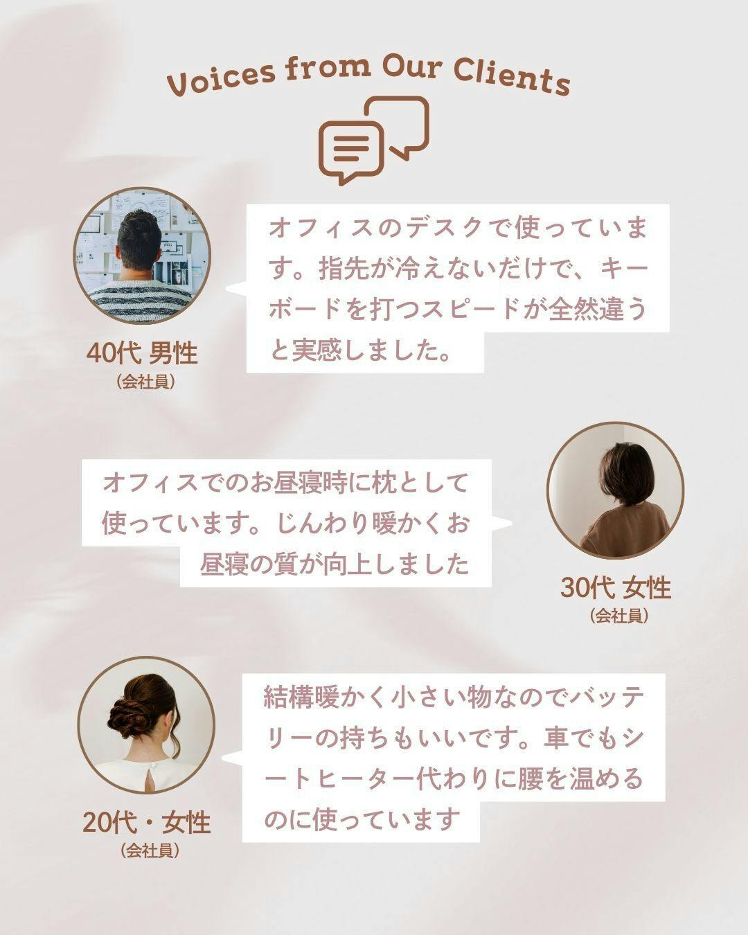 「持ち歩く暖房器具」として、毎日の通勤やデスクワークを快適にしてくれる存在。この便利さを、多くの方に体感していただきたいと思っています。