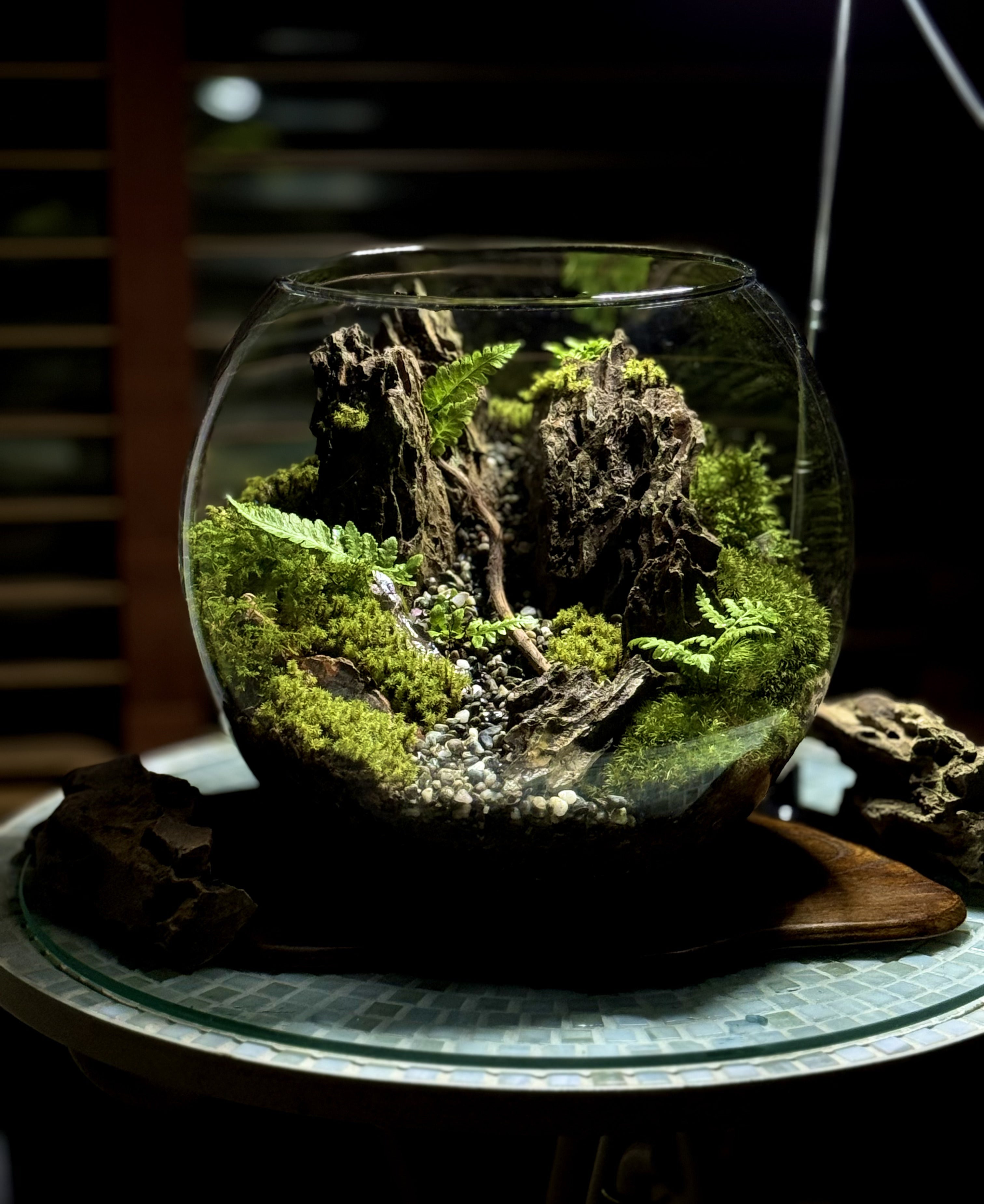 人力車をしながら、自生している苔やシダなどに自分自身が魅了されるようになり、観光とは違った形でこの大自然と歴史を表現したいと思い、副業として苔テラリウムを製作、販売するようになりました。