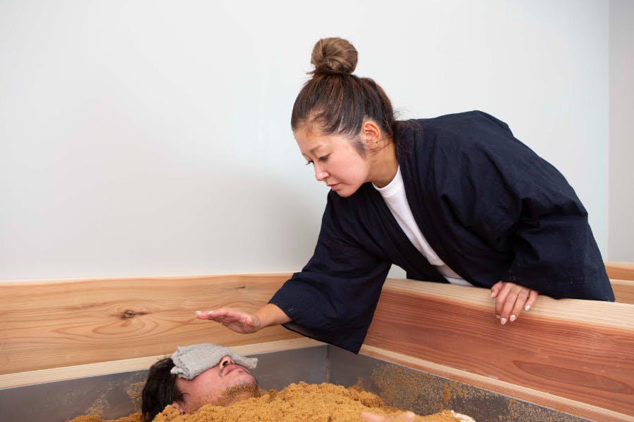 酵素風呂とは、米ぬかなどの発酵素材の中に身体をうずめ、発酵のチカラだけで身体を芯から温める温活法です。