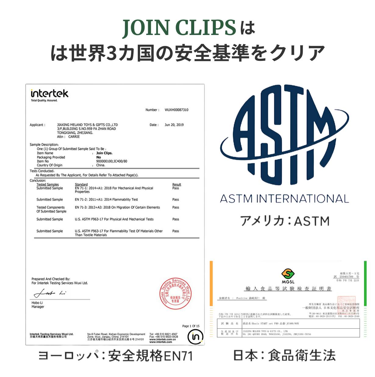 また、JOINCLIPSは ヨーロッパ(EN71)・アメリカ(ASTM)・日本(食品衛生法)の基準を満たしています。