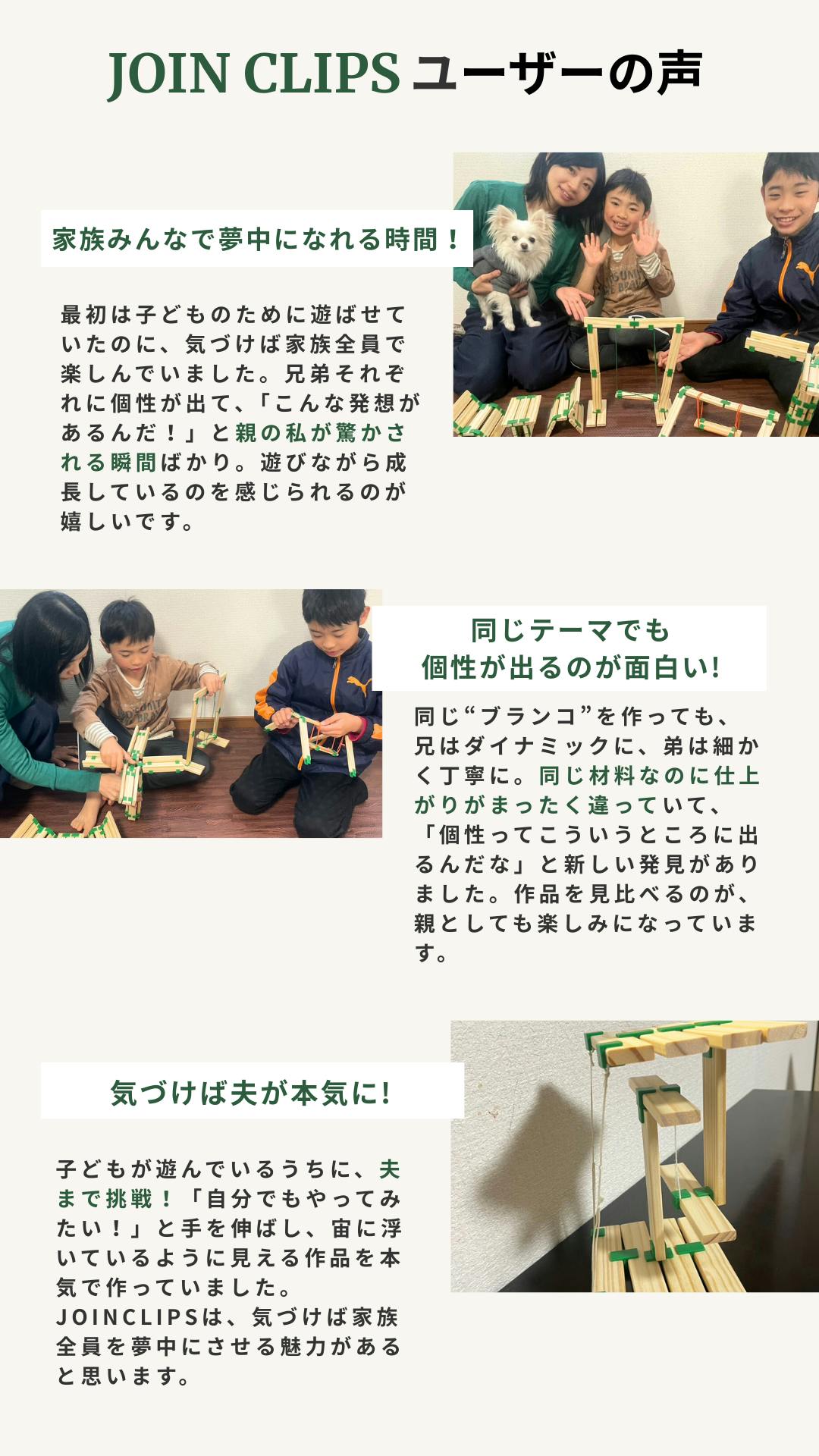 JOINCLIPSは、ただの玩具ではありません。親子の会話が生まれ、想像が形になり、思い出が積み重なる――そんな“感動のある遊び”を届けてくれる存在です。子どもたちの自由な創造力と、大人たちの心に残る感動を、ぜひ皆さまと一緒に広げていけたら嬉しいです。