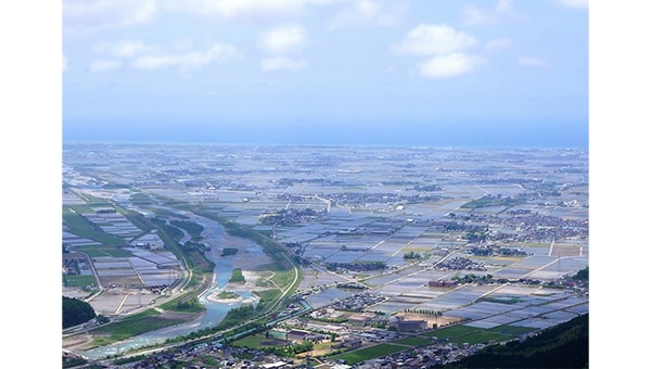 かつて「暴れ川」と呼ばれた手取川によってつくられた扇状地は、旧河川跡を利用した用水が張り巡らされ、県内屈指の穀倉地帯を形成しています。