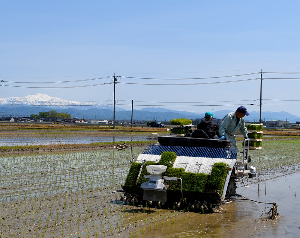 田植え時期には、豊かな雪解け水が水田を潤し、水鏡が空を映す鮮やかな光景が広がります。