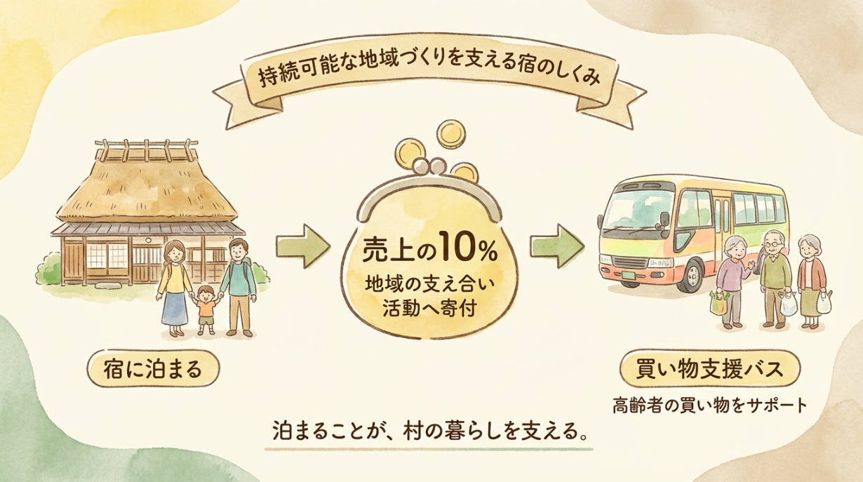 宿の売上の10%は、村の買い物バスの運営支援など、持続可能な地域支援事業へ。