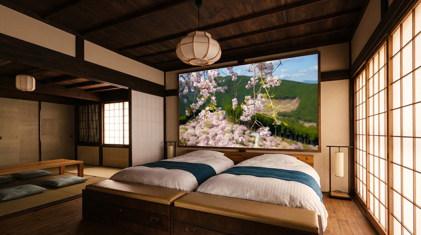 寝室の壁面に【展示壁(約1.8m)】を設置し、扉を開けた瞬間から季節に包まれる体験へ。