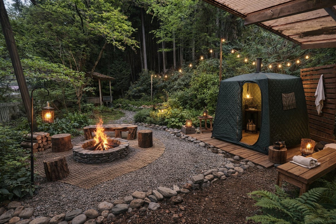 ▼広い庭。焚火スペース・サウナ後はそのまま川ドボン。