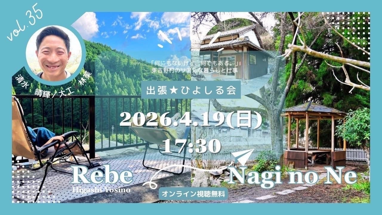 2026/04/18 22:40いつも応援いただきありがとうございます。Nagi no Ne 東吉野のオープンに向けて、少しずつ準備が進んでいます。今回はそのプレオープン的な機会として、東吉野村の暮らしや仕事を体感できるイベント「ひよしる会 Vol.35」を開催します。■今回のゲスト清水 晴輝さん(大工 × 林業)木を「切る」林業と、木を「使う」大工。本来分かれている仕事を横断しながら、地域の資源を活かして“仕事をつくる”生き方を実践されています。山に入り、木を選び、伐り出し、その木を使って暮らしをつくる。都市とは異なる「仕事と暮らしが地続きになっている感覚」は、東吉野村らしい働き方の一つです。当日は、そんなリアルな話を直接聞ける機会になっています。■開催場所について会場は、2026年4月オープン予定の写真家監修の一棟貸し宿「Nagi no Ne 東吉野」。まだ完成前のこのタイミングだからこそ、これから始まる場の空気を一足先に感じていただけます。■イベント概要日時:2026年4月19日(日)①ゲストトーク:17:30-18:30(オンライン参加OK)②現地交流会:18:30-20:00■参加方法①オンライン(無料)②現地参加(定員30名・参加費1,000円)※軽食・ソフトドリンク付き/アルコール持ち込み可▶宿泊も可能ドミトリー:大人5,000円 / 学生3,000円■お申込みはこちらhttps://docs.google.com/forms/d/e/1FAIpQLSdpnbuxpcE3g9oJ9PFfplPcf0aN5R042EPhsGhRz3Ziyr2ACA/viewform■オンライン参加(当日)https://zoom.us/j/97841582949?pwd=hCjpbWvKjsW2ia4E6b8CrOOaZt6gFb.1ミーティングID:978 4158 2949パスコード:487562■最後にこのプロジェクトは、「宿をつくること」がゴールではなく、人と地域が出会い、関わりしろが生まれることを目指しています。もし少しでも気になっていただけたら、ぜひオンラインでも覗いてみてください。また、周りに関心がありそうな方がいれば、シェアいただけると嬉しいです。引き続き、応援よろしくお願いいたします。 もっと見る