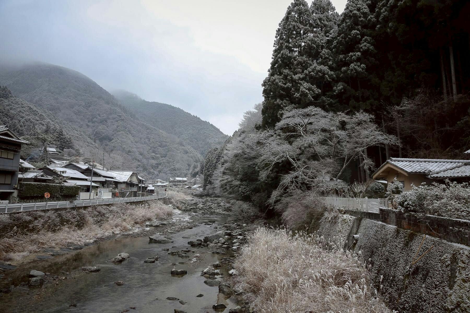うっすら雪が積もる川辺、